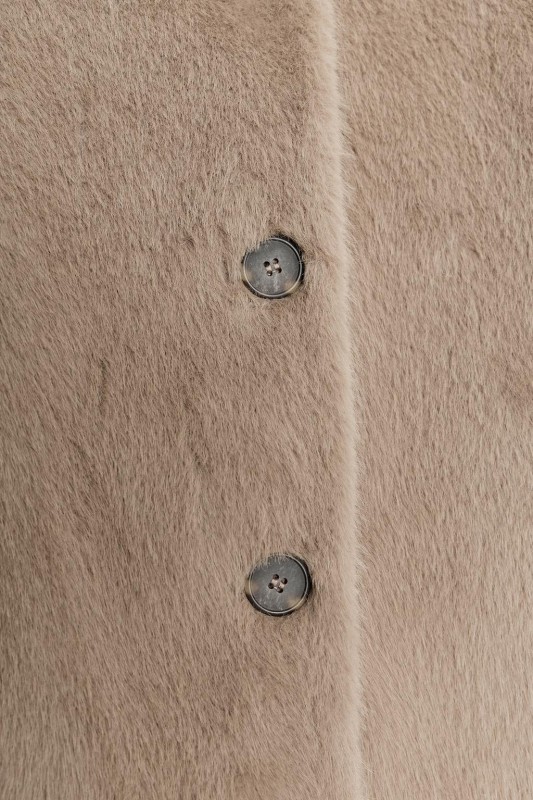 Round neck, long sleeve jacket. Faux fur outer fabric. Button-up front.