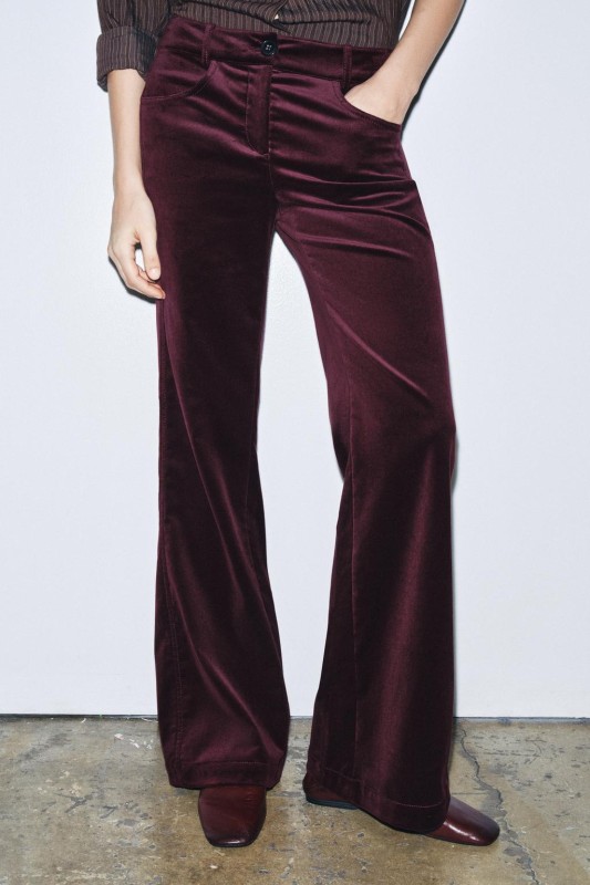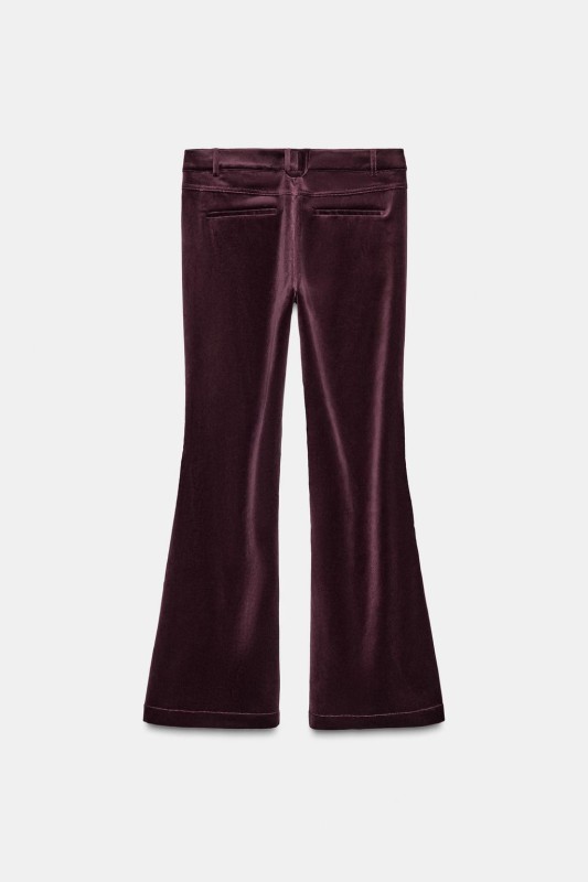 Trousers made from velvet fabric. Low waist with belt loops. Front and back pockets. Flared hem. Front zip and button fastening.