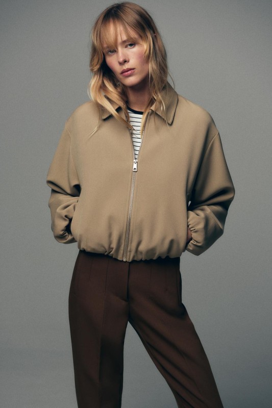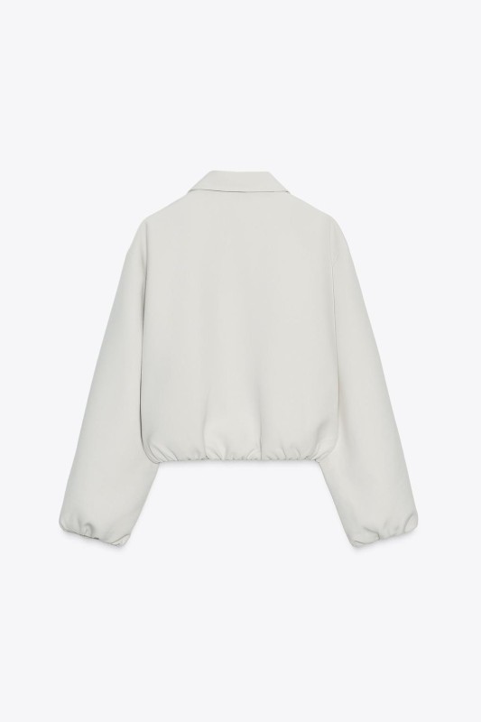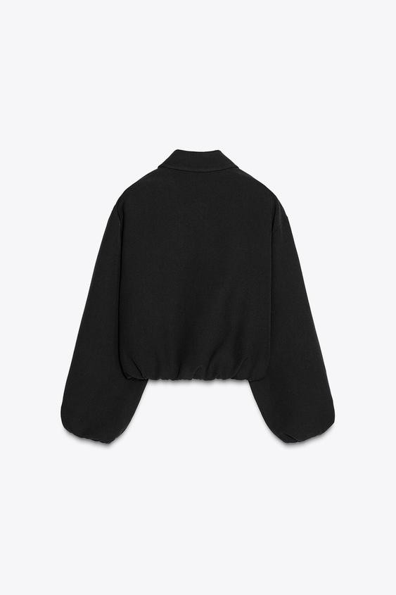 Long sleeve bomber jacket with a lapel collar. Featuring false front double welt pockets, puffed and elastic trims, and a zip-up front.