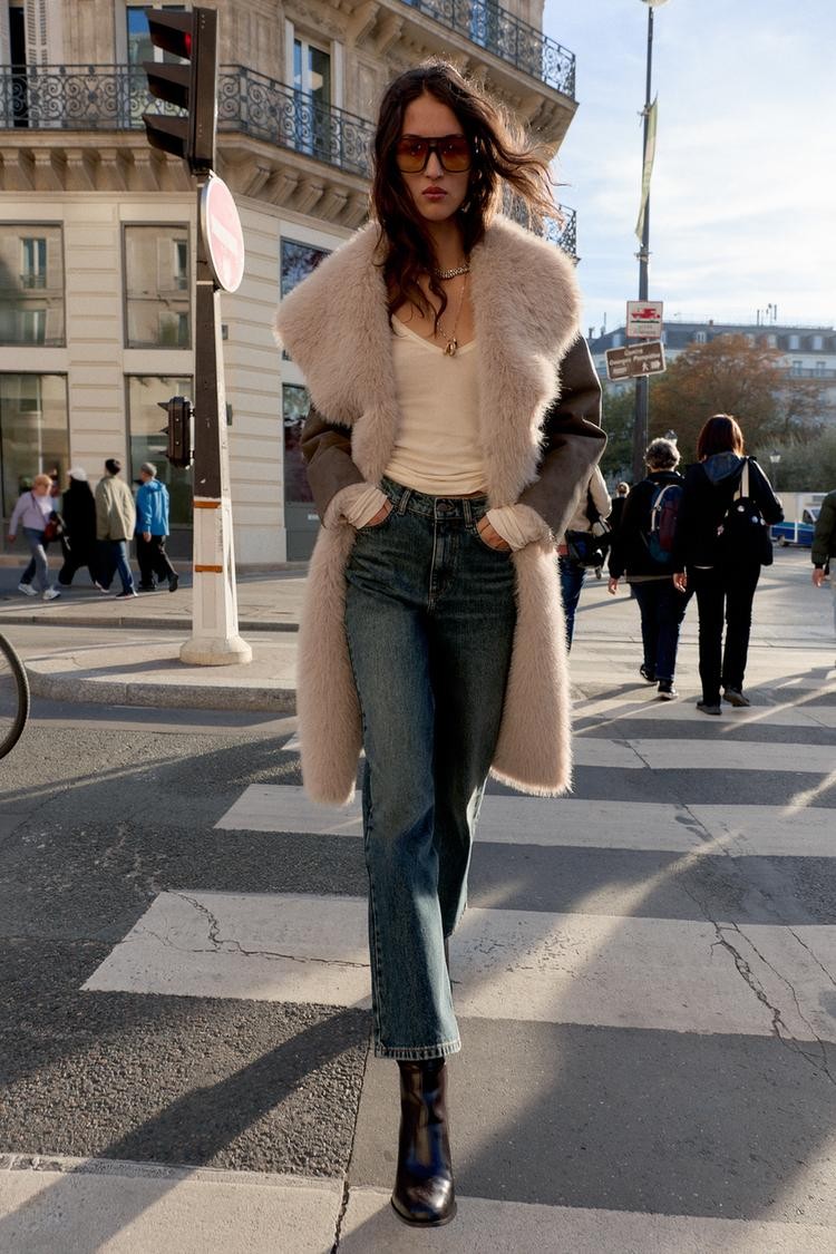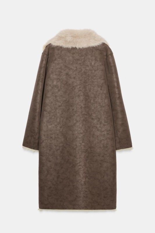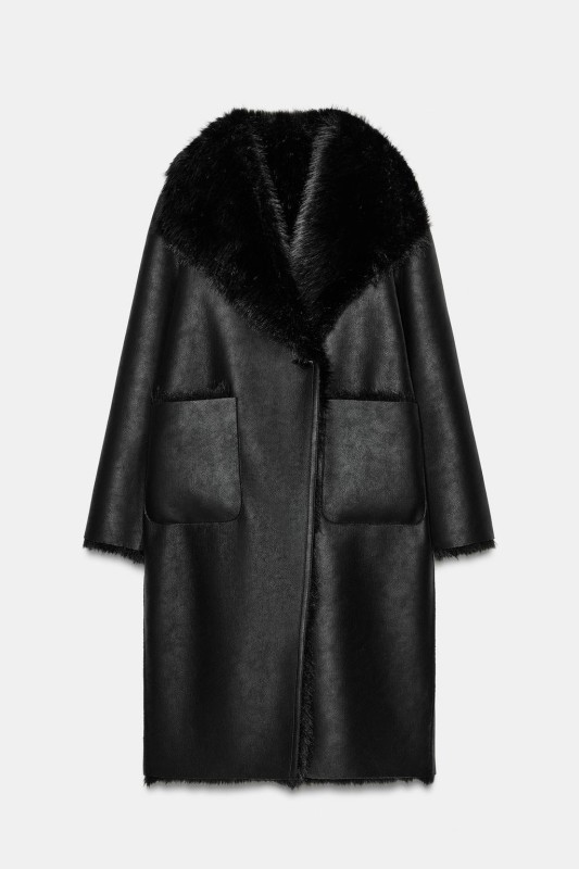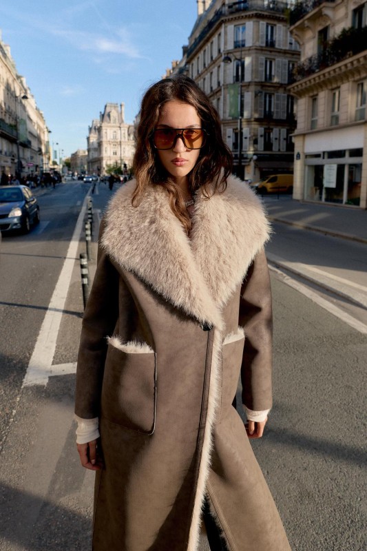 Coat with a lapel collar and long sleeves. Featuring front pockets, combined faux fur and faux suede fabric, and a double-breasted button-up front.