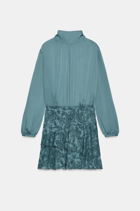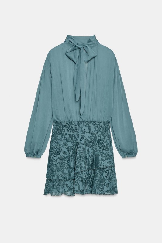 High neck dress with tie detail and long sleeve. Featuring a semi-sheer combined fabric and a skirt with jacquard velvet. Open back. Ruffled hem. Invisible side zip fastening. Interior lining.