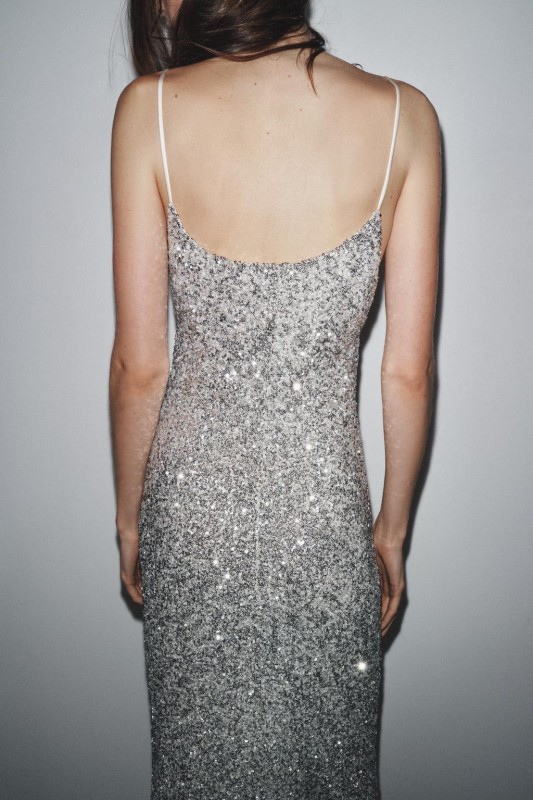 Long dress with a round neck and thin straps. Featuring interior lining and sequin appliqué detail.
