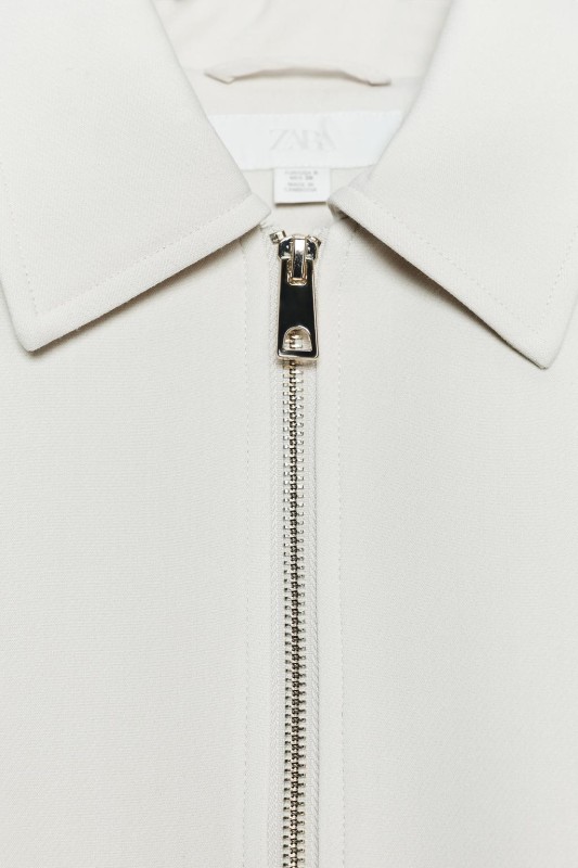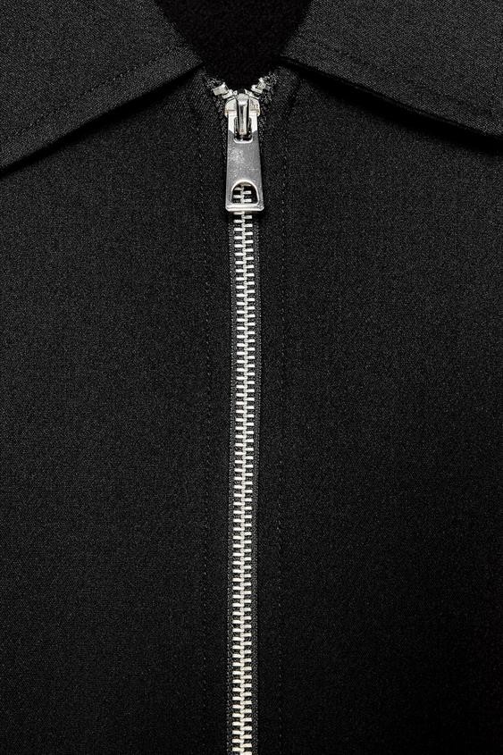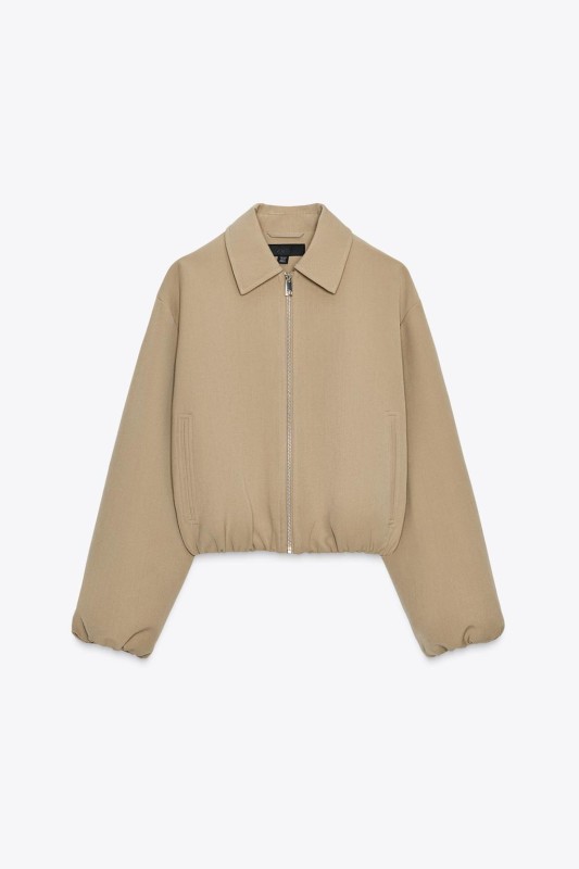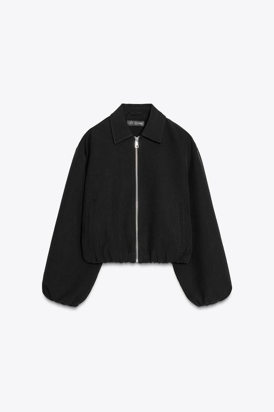 Long sleeve bomber jacket with a lapel collar. Featuring false front double welt pockets, puffed and elastic trims, and a zip-up front.