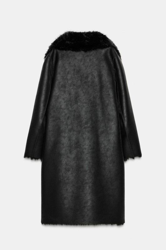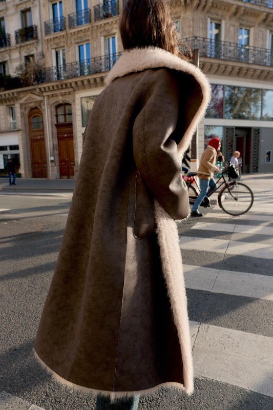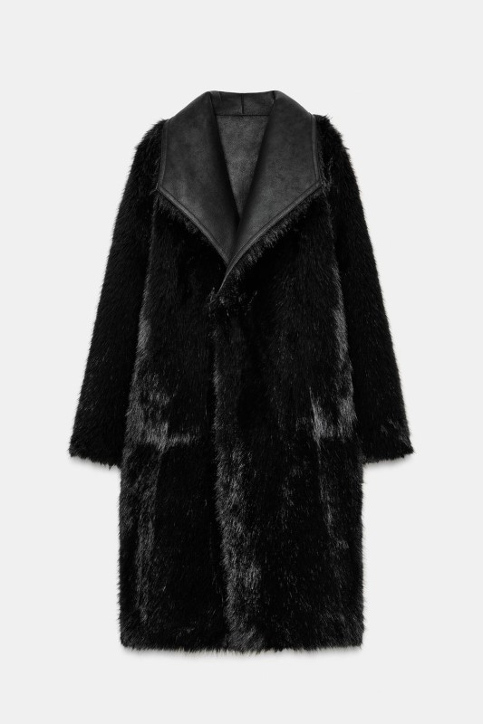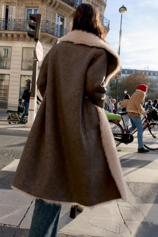 Coat with a lapel collar and long sleeves. Featuring front pockets, combined faux fur and faux suede fabric, and a double-breasted button-up front.