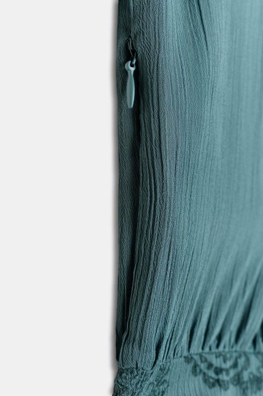 High neck dress with tie detail and long sleeve. Featuring a semi-sheer combined fabric and a skirt with jacquard velvet. Open back. Ruffled hem. Invisible side zip fastening. Interior lining.
