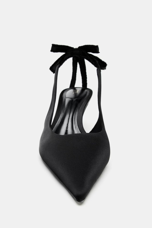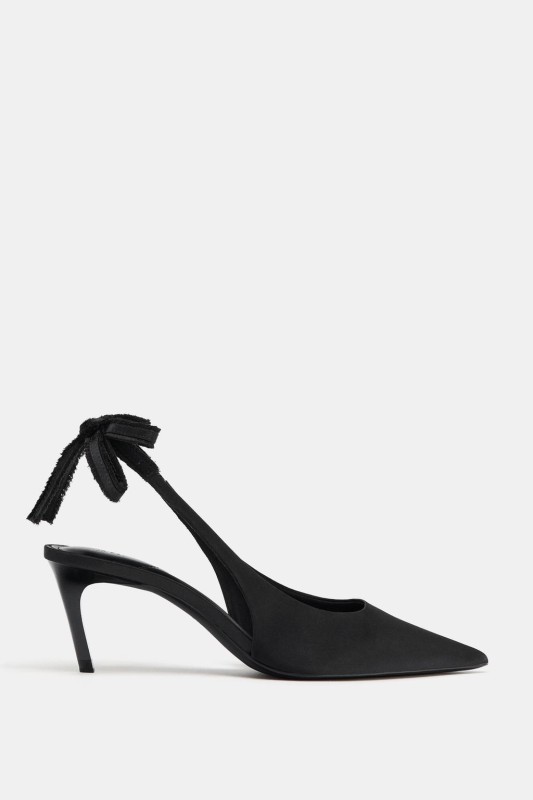 Slingback shoes. Satin effect. Frayed bow detail on the back. Elasticated back strap. Pointed toe.